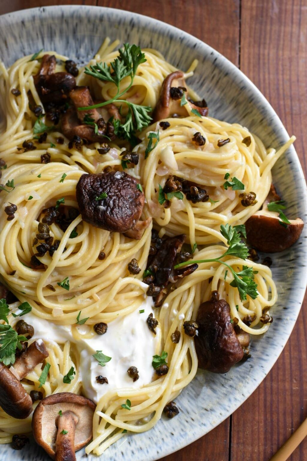 Al dente pasta tossed in a bright lemon-butter reduction with sautéed shiitake mushrooms, finished with a creamy honey-lemon yogurt dollop and crispy fried capers.